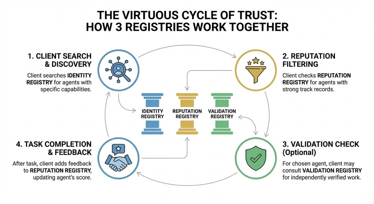 ERC-8004 is proposed precisely in this context. It does not answer what AI can do. It addresses a deeper premise: in a world without centralized guarantors, how can AI be treated as a trustworthy economic actor?