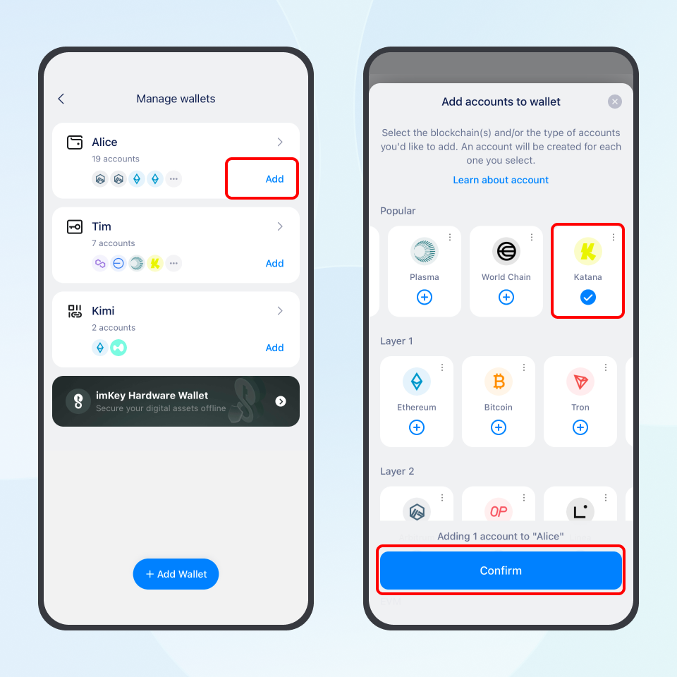 To create a Katana account, navigate to "My Profile" -> "Manage wallets" -> "Add". In the Popular section, swipe left, select the "Katana" network, and confirm. Then, return to the wallet homepage to access your newly created Katana account.