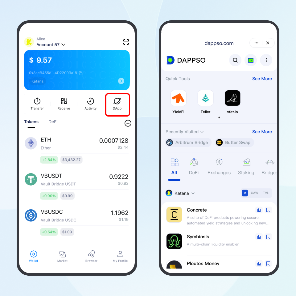 Click "DApp" on the account homepage to view and experience recent popular DApps on Katana.